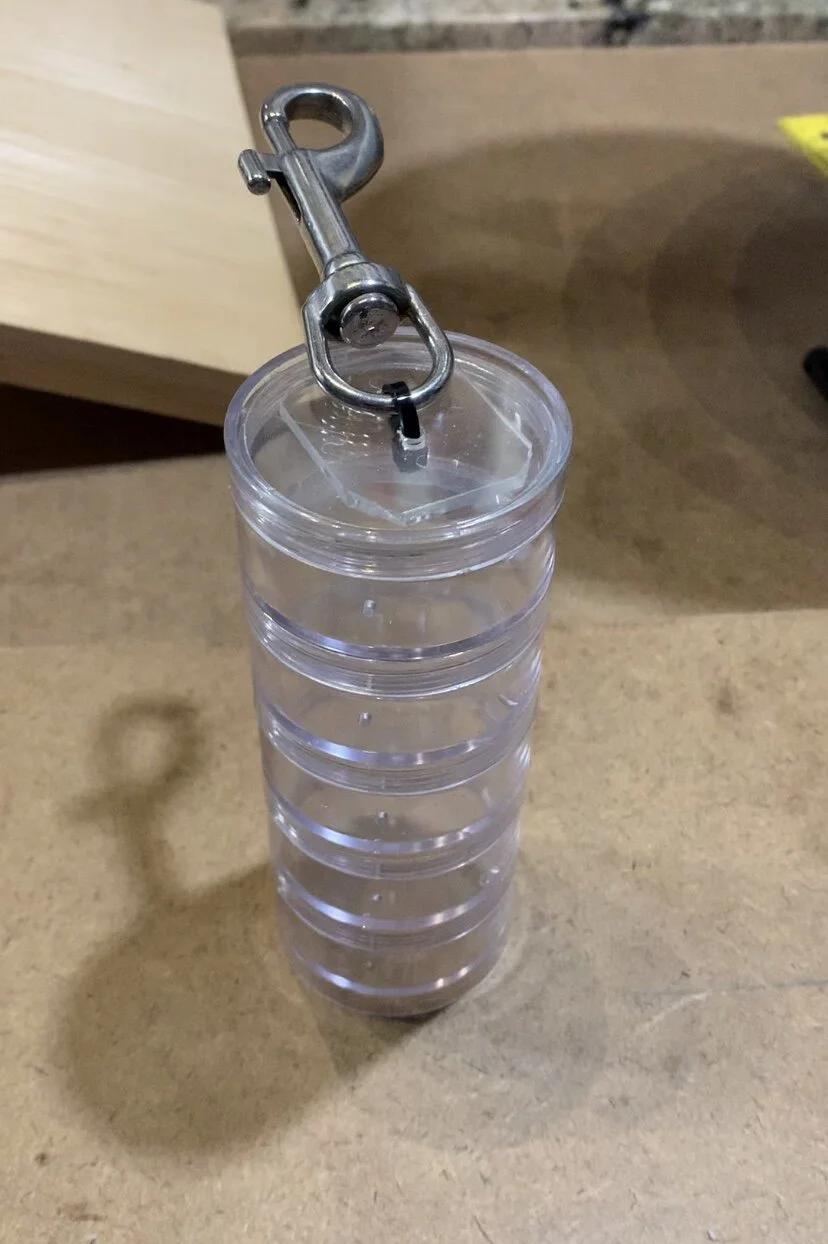 Dave came up with the cleaver idea of using a circular container commonly used for fishing components. The container has multiple stacked compartments which can be separated to hold several samples. Dave drilled small holes in each compartment to allow for pressure equalization. Finally, he attached a simple bolt snap to secure it to a dry suit pocket bungee. Given its small size, a dive team could carry multiple devices on a dive.